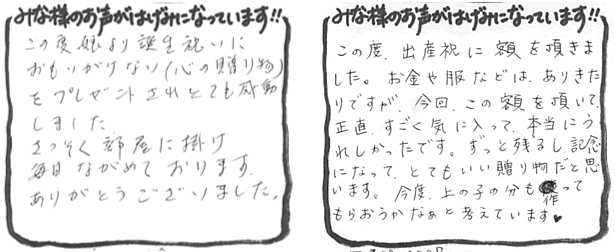 大変素晴らしい作品で私も母も大変喜んでおります。リビングに飾ってあるのですが来るお客さんも、すごい、いいなぁと言っています。感動して泣いてる人もいます。本当にありがとう御座いました。また何かの時は よろしくお願い致します。