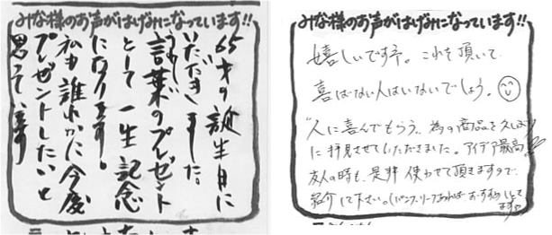 こんばんは。先ほど、お願い致してました品物が届きました。心温まるお言葉のお手紙も頂き、ありがとうございました。来週13日に夫婦そろって、開店祝いとして、早速お店へ伺う予定です。きっと喜んで頂けると確信しております。私たちも、一緒に拝見させて頂く事をたのしみにしております。本当にありがとうございました。